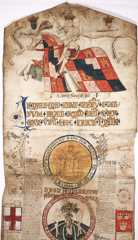 The full document, accessible here illustrates the family tree of Edward IV back to Adam and Eve. Either side of the main text are the insignia of Edward’s ancestors. The text, in Latin, states “By God this one was created.”
